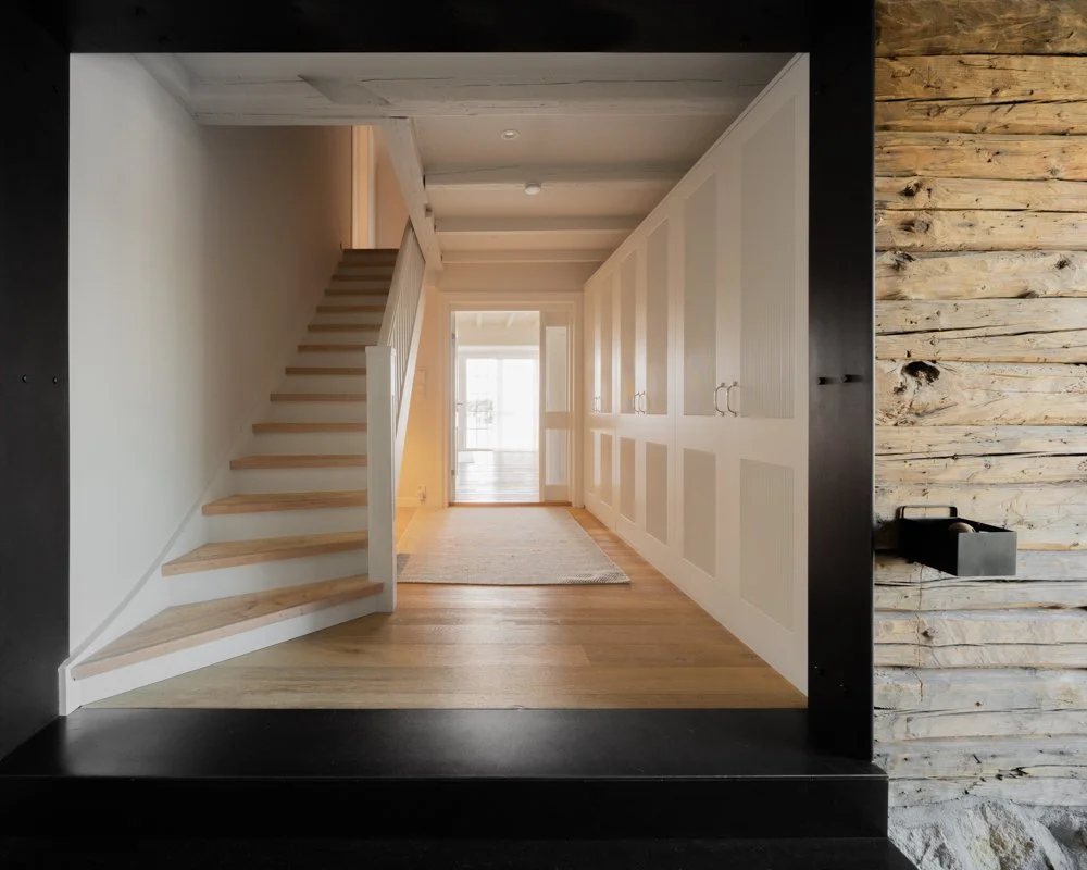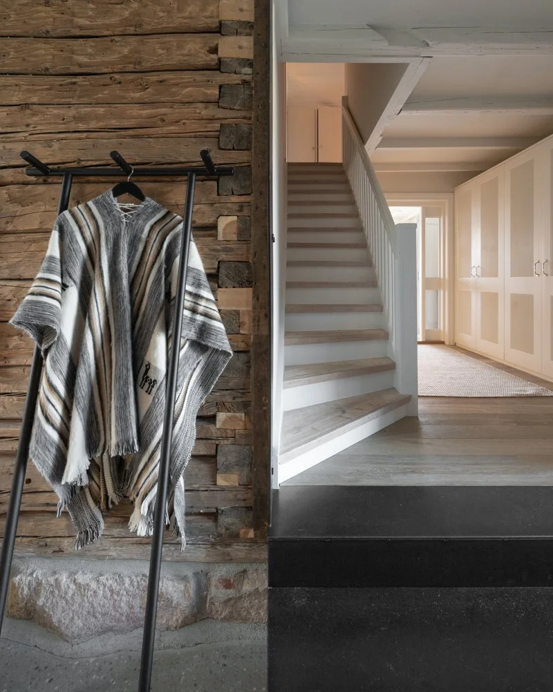 Innvendig har laftede vegger kommet frem hvor deler av laften er restaurert. Ulik lysinnslipp og materialitet bidrar til å skape kontrast mellom gammelt og nytt.