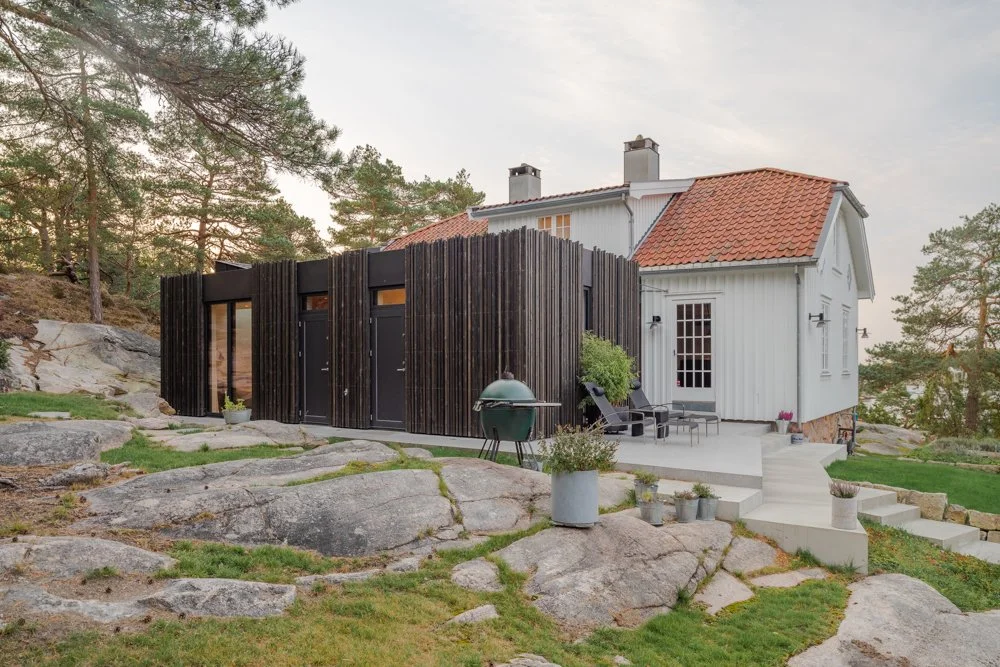 Et falleferdig tilbygg mot nord er revet. Her har det blitt gjenoppført et nytt tilbygg i kontrast til huset. Volumet er kledd i brunbeiset spilekledning i ulike dybder, høyder og bredder.